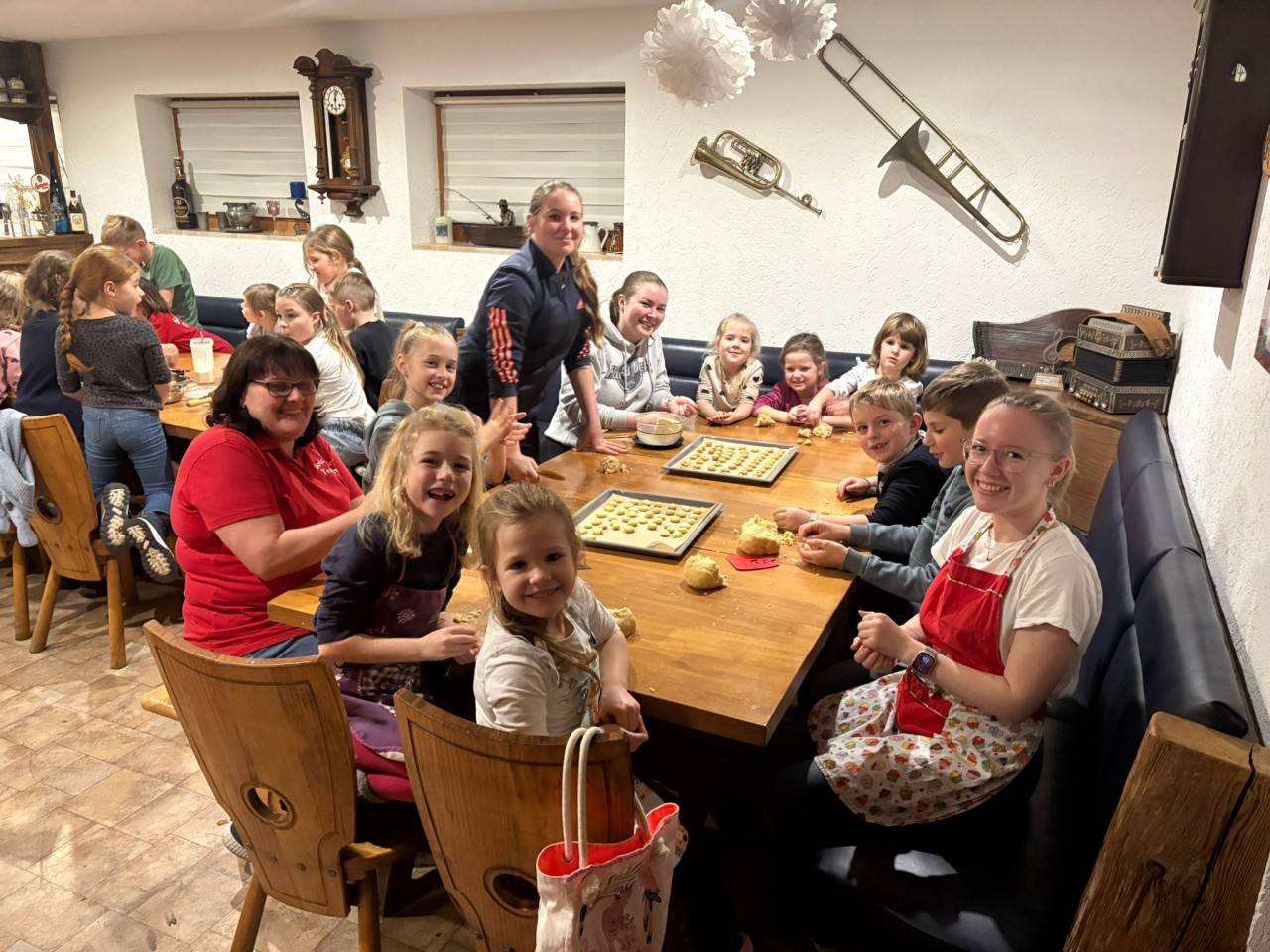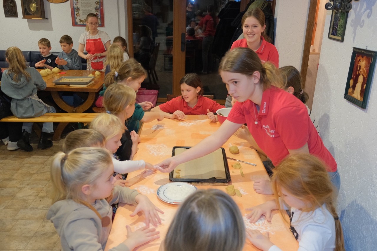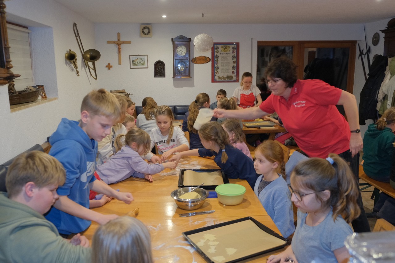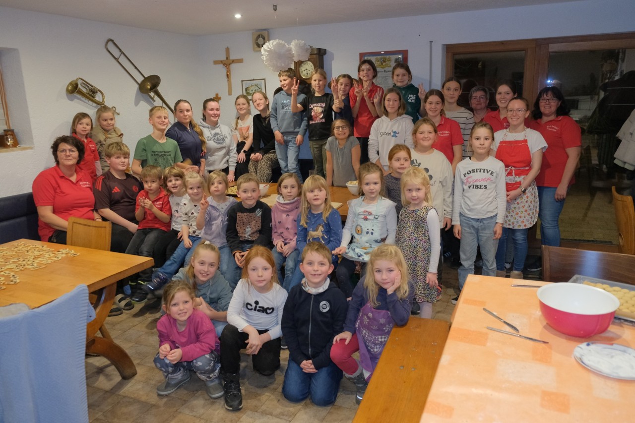 Fast 40 Kinder und Jugendliche folgten der Einladung von Musikwartin Cornelia Schmid und verwandelten den Partyraum für einen Nachmittag in eine duftende Weihnachtswerkstatt. Jugendleiterin Michi Greiner hatte mit ihrem Betreuerteam die verschiedenen Teige schon vorbereitet und leitete die Jungtrachtler erst an. Mit viel Eifer und noch mehr Mehl wurden Vanillekipferl, Husarenkrapferl, Butter‑ und Kokosplätzchen sowie feines Sandgebäck geformt, ausgestochen und verziert.
