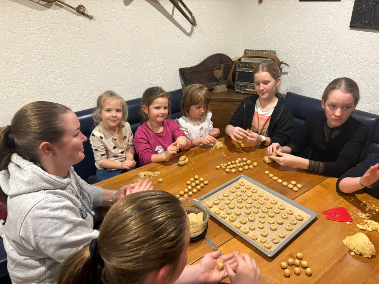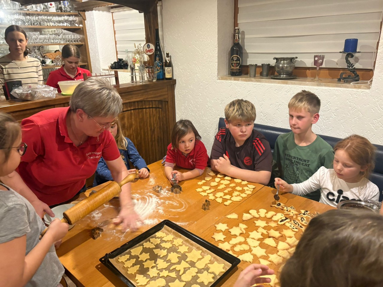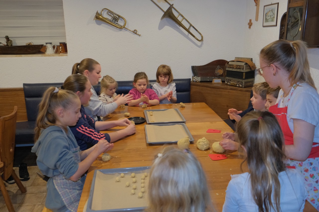 Fast 40 Kinder und Jugendliche folgten der Einladung von Musikwartin Cornelia Schmid und verwandelten den Partyraum für einen Nachmittag in eine duftende Weihnachtswerkstatt. Jugendleiterin Michi Greiner hatte mit ihrem Betreuerteam die verschiedenen Teige schon vorbereitet und leitete die Jungtrachtler erst an. Mit viel Eifer und noch mehr Mehl wurden Vanillekipferl, Husarenkrapferl, Butter‑ und Kokosplätzchen sowie feines Sandgebäck geformt, ausgestochen und verziert.